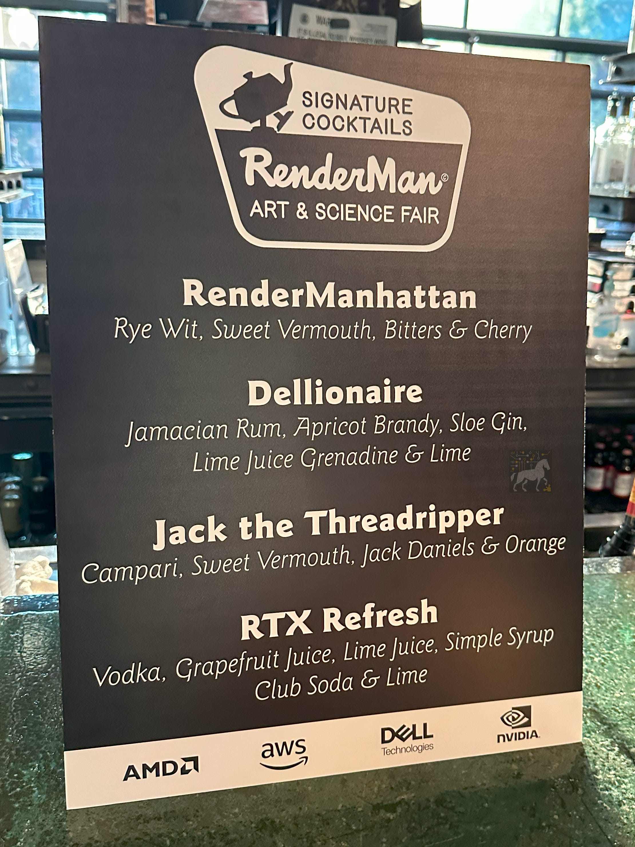 RenderMan Walking Teapot Museum 2024 - Credit: Pixar’s Dylan Sisson - Source: https://renderman.pixar.com/news/renderman-at-siggraph-2024 While you are there, you might enjoy one of these amazing cocktails. Great job Pixar, Dell, AMD & Nvidia with your cocktail naming! 🤓
